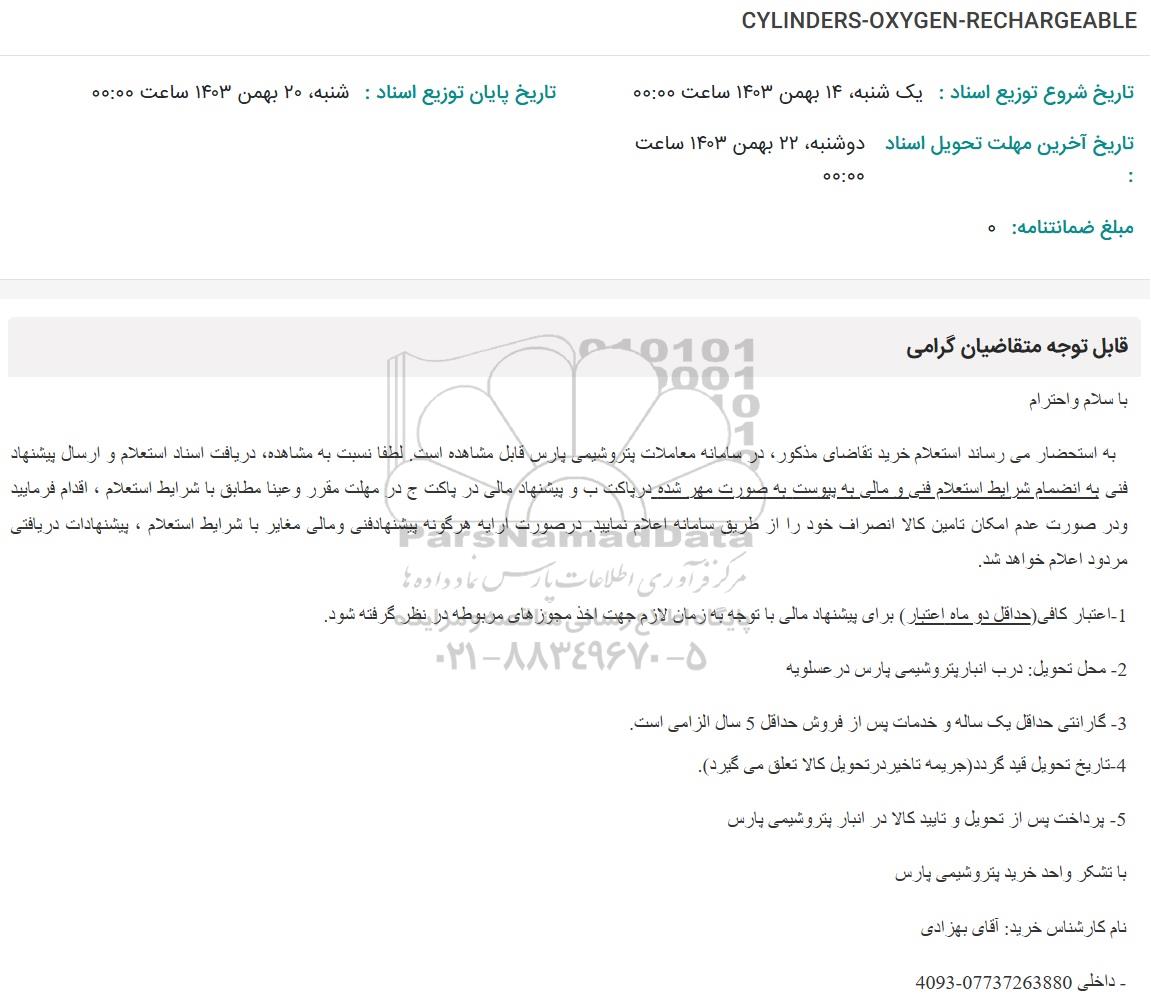به استحضار می رساند استعلام خرید تقاضای مذکور در سامانه معاملات پتروشیمی پارس قابل مشاهده است. لطفا نسبت به مشاهده دریافت اسناد استعلام و ارسال پیشنهاد فنی به انضمام شرایط استعلام فنی و مالی به پیوست به صورت مهر شده در پاکت ب و پیشنهاد مالی در پاکت ج در مهلت مقرر وعینا مطابق با شرایط استعلام ، اقدام فرمایید و در صورت عدم امکان تامین کالا انصراف خود را از طریق سامانه اعلام نمایید. در صورت ارایه هرگونه پیشنهاد فنی و مالی مغایر با شرایط استعلام ، پیشنهادات دریافتی مردود اعلام خواهد شد.