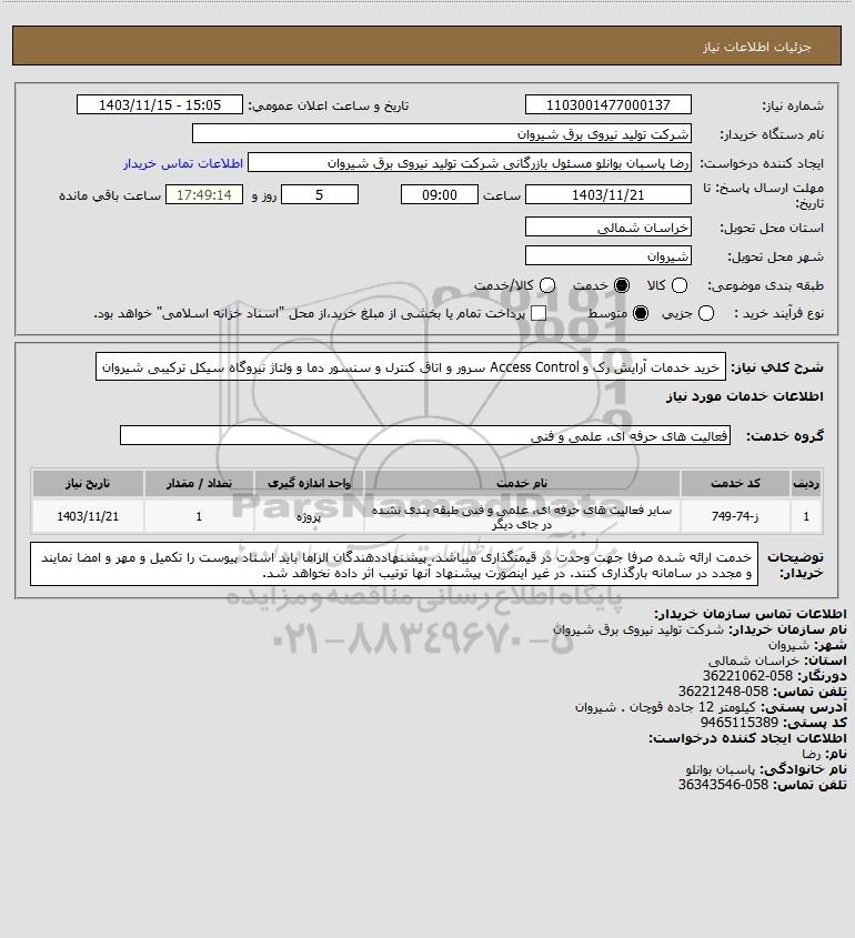 شرح کلی نیاز: خرید خدمات آرایش رک و Access Control سرور و اتاق کنترل و سنسور دما و ولتاژ نیروگاه سیکل ترکیبی شیروان