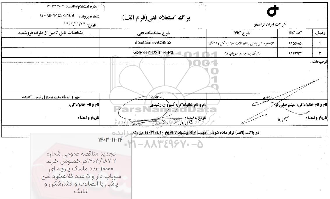 تجدید مناقصه عمومی شماره 2-1403/187 در خصوص خرید 10000 عدد ماسک پارچه ای سوپاپ دار و 5 عدد کلاهخود شن پاشی با اتصالات و فشارشکن و شلنگ