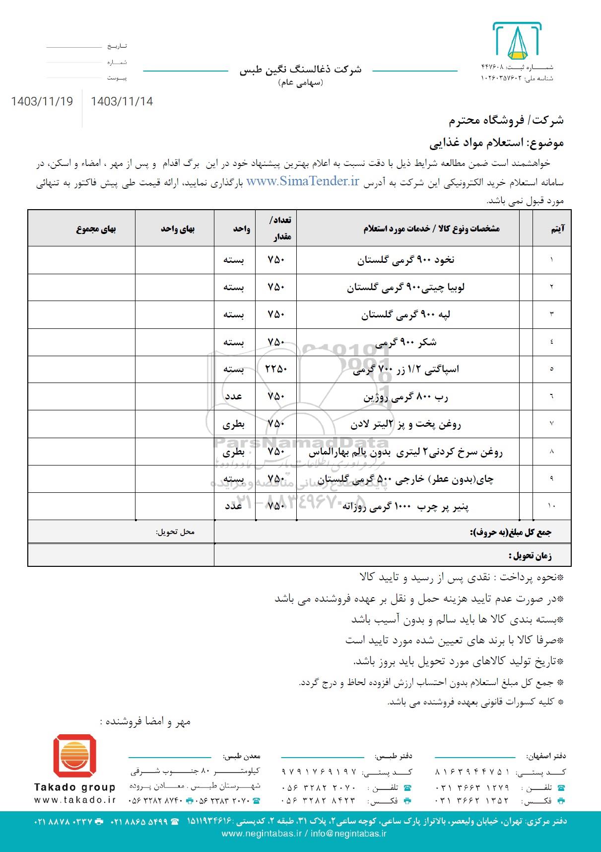 استعلام بها و موضوع استعلام استعلام مواد غذایی به اطلاع کلیه شرکتها و افراد متخصص واجد شرایط میرساند، آگهی گذار در نظر دارد از طریق استعلام بها، نسبت به انتخاب و دریافت پیشنهادات اقدام نماید. این استعلام با کد آگهی ثبت شده در سامانه خبرگزاری پارس نماد : 8633235 منتشر شده است. مشخصات استعلام : تاریخ شروع استعلام: 1403/11/15 آخرین مهلت ارسال پیشنهاد قیمت : 1403/11/19 و محل اجرای پروژه : استان تهران میباشد. استعلام قیمت مورد درخواست : استعلام مواد غذایی با دستهبندیهای تخصصی و گروه های مرتبط : مواد غذایی, استعلام اطلاع رسانی میگردد.