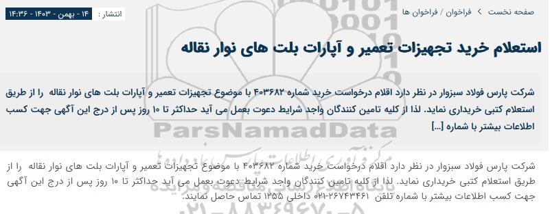 شرکت پارس فولاد سبزوار در نظر دارد اقلام درخواست خرید شماره 403682 با موضوع تجهیزات تعمیر و آپارات بلت های نوار نقاله را از طریق استعلام کتبی خریداری نماید لذا از کلیه تامین کنندگان واجد شرایط دعوت بعمل می آید حداکثر تا 10 روز پس از درج این آگهی جهت کسب اطلاعات بیشتر با شماره تلفن 26743461-021 داخلی 1255 تماس حاصل نمایند.