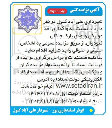 شهرداری علی آباد کتول در نظر دارد نسبت به واگذاری اخذ عوارض ورودی پارک جنگلی کبودوال، از طریق مزایده عمومی به اشخاص حقیقی و حقوقی واجد شرایط اقدام نماید. لذا کلیه مستندات و مراحل برگزاری مزایده از دریافت اسناد تا ارائه پیشنهاد مزایده گران و بازگشایی پاکت ها از طریق سامانه تدارکات الکترونیکی دولت ستاد به آدرس ستاد ایران انجام خواهد شد.