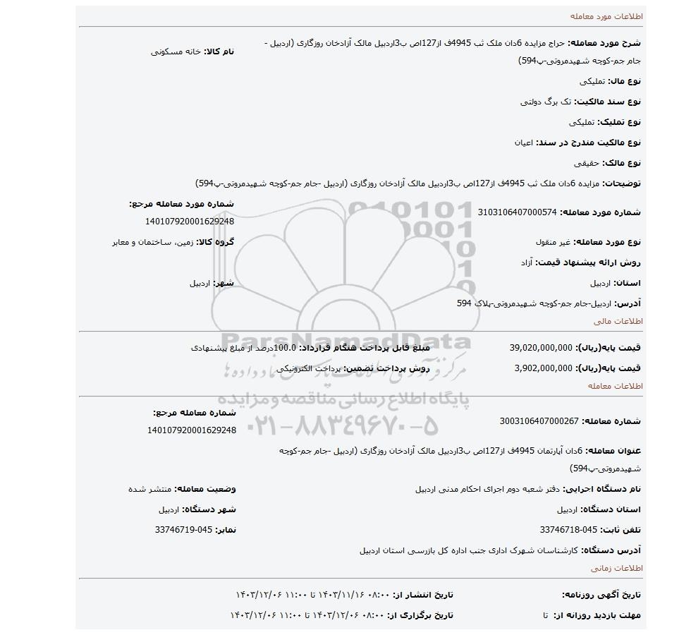 شماره معامله: 3003106407000267 | شماره معامله مرجع: 140107920001629248 | |