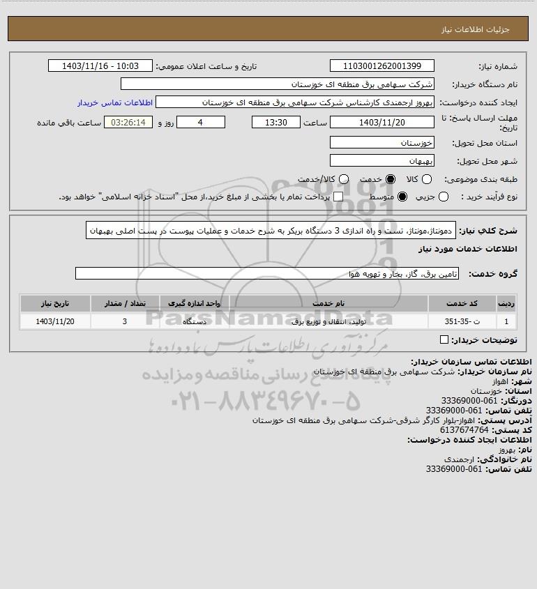 شرح کلی نیاز: دمونتاژ،مونتاژ، تست و راه اندازی 3 دستگاه بریکر به شرح خدمات و عملیات پیوست در پست اصلی بهبهان