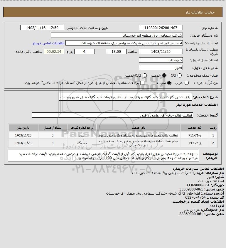 شرح کلی نیاز: رفع نشتی گاز SF6 از کلید گازی و رفع عیب از مکانیزم فرمان کلید گازی طبق شرح پیوست