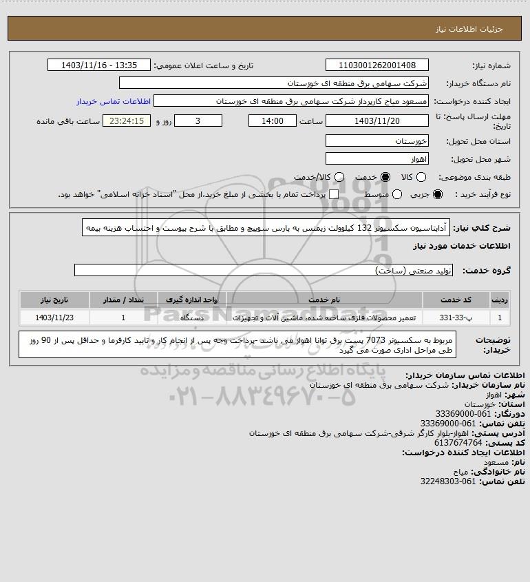 شرح کلی نیاز: آداپتاسیون سکسیونر 132 کیلوولت زیمنس به پارس سوییچ و مطابق با شرح پیوست و احتساب هزینه بیمه