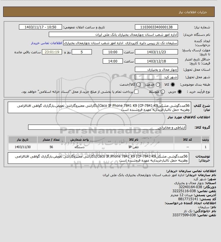 شرح کلی نیاز: 56عددگوشی مشکیCisco IP Phone 7841 K9 (CP-7841-K9)باگارانتی معتبروگارانتی تعویض.بارگزاری گواهی افتاالزامی وهزینه حمل تاانبارخریداربه عهده فروشنده است