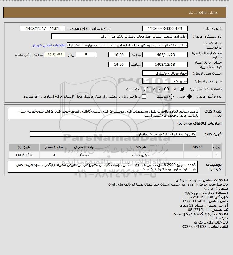 شرح کلی نیاز: 3عدد سوئیچ 2960 48پورت طبق مشخصات فنی پیوست-گارانتی معتبروگارانتی تعویض-مجوزافتابارگزاری شود-هزینه حمل بارتاانبارخریداربرعهده فروشنده است