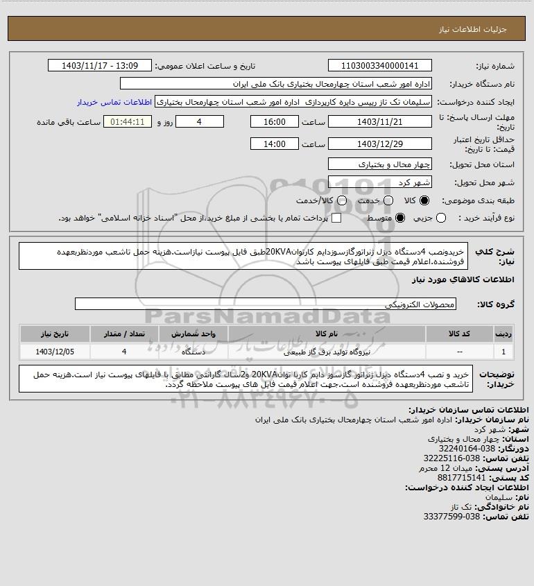 شرح کلی نیاز: خریدونصب 4دستگاه دیزل ژنراتورگازسوزدایم کارتوان20KVAطبق فایل پیوست نیازاست.هزینه حمل تاشعب موردنظربعهده فروشنده.اعلام قیمت طبق فایلهای پیوست باشد