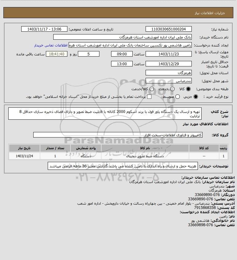 شرح کلی نیاز: تهیه و ارسال یک دستگاه پاور فول با برند اسکوم 2000 کاناله با قابلیت ضبط تصویر و دارای فضای ذخیره سازی حداقل 8 ترابایت