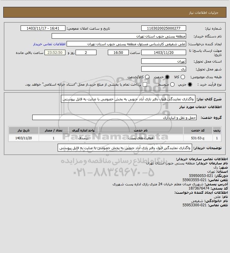 شرح کلی نیاز: واگذاری نمایندگی قبول دفتر نازی آباد جنوبی به بخش خصوصی با عنایت به فایل پیوستی