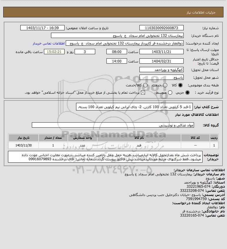 شرح کلی نیاز: 1-قند 5 کیلویی تعداد 100 کارتن.