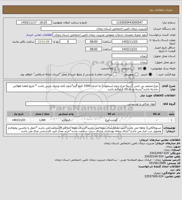 شرح کلی نیاز: مرغ منجمد بی خس (سینه مرغ بدون استخوان) به اندازه 1000 کیلو گرم*بدون کتف وبدون چربی باشد * تاریخ انقضا طولانی داشته باشد*بسته بندی 15 کیلوگرم باشد