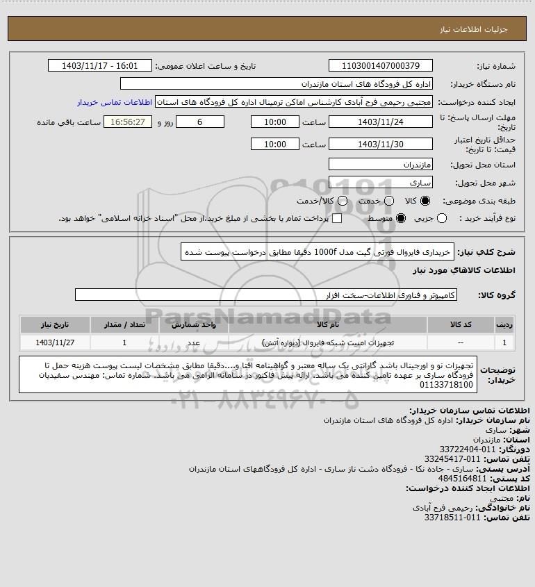 توضیحات خریدار:تجهیزات نو و اورجینال باشد گارانتی یک ساله معتبر و گواهینامه افتا و....دقیقا مطابق مشخصات لیست پیوست هزینه حمل تا فرودگاه ساری بر عهده تامین کننده می باشد. ارائه پیش فاکتور در سامانه الزامی می باشد. شماره تماس: مهندس سفیدیان 01133718100