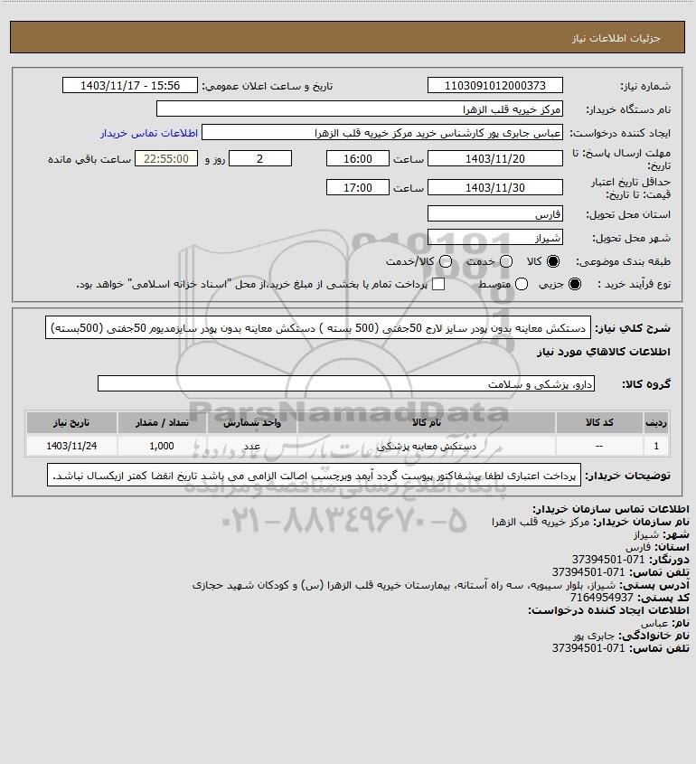 شرح کلی نیاز: دستکش معاینه بدون پودر سایز لارج 50جفتی (500 بسته )