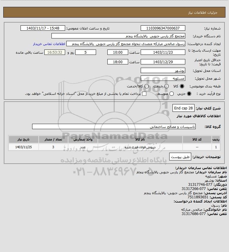 | 1 | -- | درپوش فولاد فورج شده | عدد | 3 | 1403/11/25 |