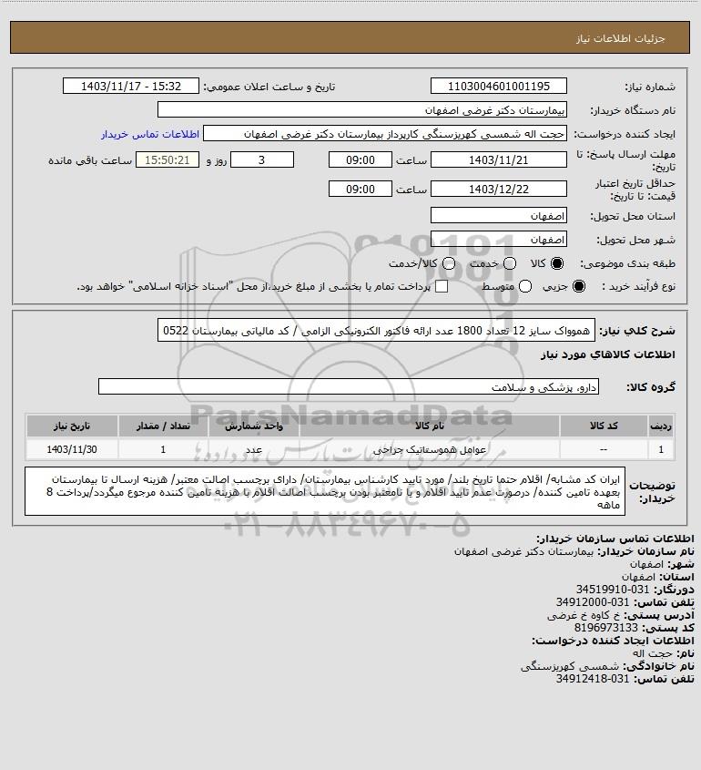 شرح کلی نیاز: هموواک سایز 12 تعداد 1800 عدد