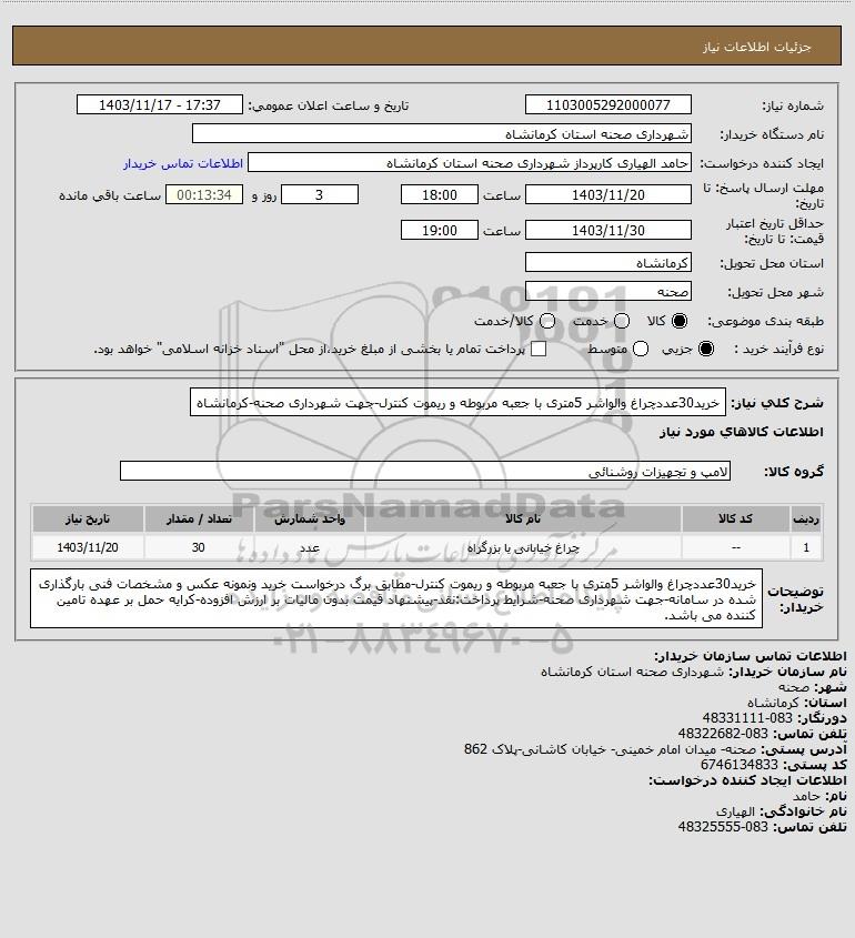 شرح کلی نیاز: خرید30عددچراغ والواشر 5متری با جعبه مربوطه و ریموت کنترل-جهت شهرداری صحنه-کرمانشاه