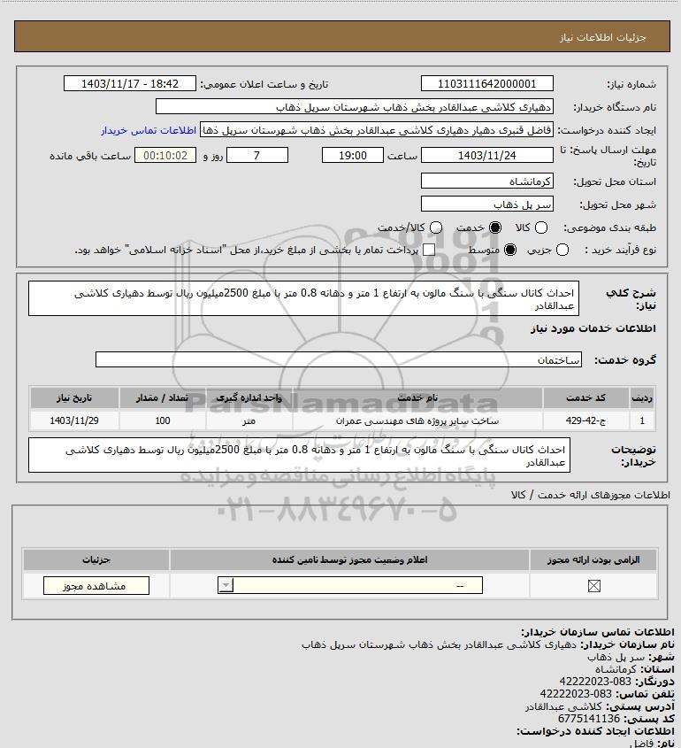 شرح کلی نیاز: احداث کانال سنگی با سنگ مالون به ارتفاع 1 متر و دهانه 0.8 متر با مبلغ 2500میلیون ریال توسط دهیاری کلاشی عبدالقادر