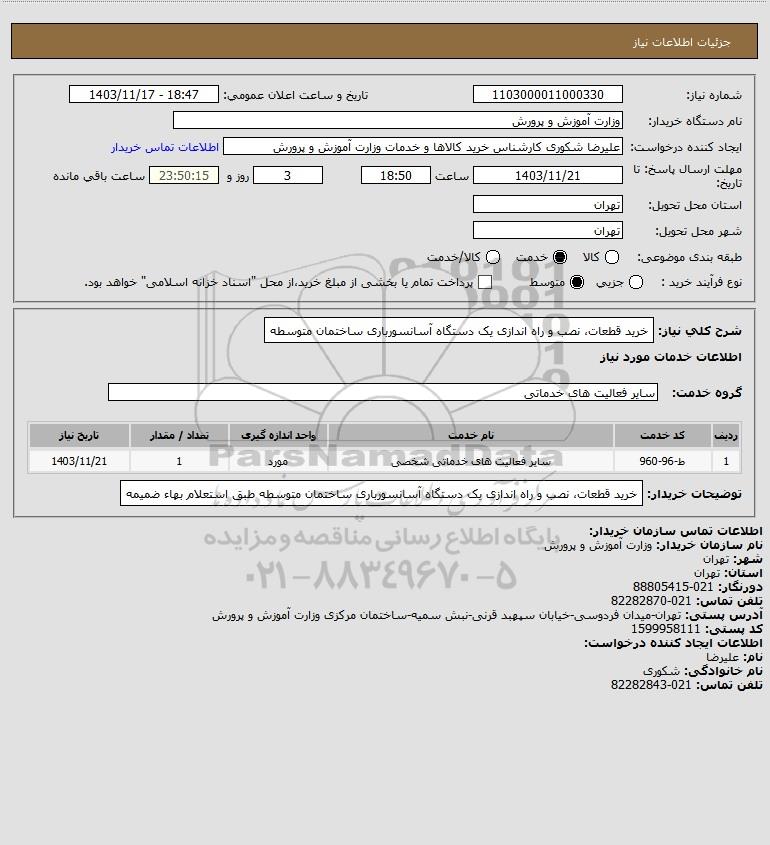 شرح کلی نیاز: خرید قطعات، نصب و راه اندازی یک دستگاه آسانسورباری ساختمان متوسطه