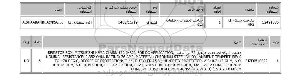 | 52491386 | مقاومت شبکه ای HR2 | 1 | ساخت تجهیزات و قطعات یدکی | کشوری | 1403/11/19 | اکرم شعبانی نیا | A.SHAABANINIA@KSC.IR |