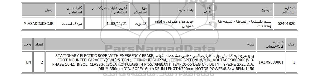 52491820سیم بکسلها - زنجیرها - تسمه ها ومتعلقات1خرید مواد مصرفی و اقلام عمومیکشوری1403/11/21مزدک اسدیM.ASADI@KSC.IR