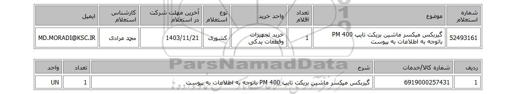 | 52493161 | گیربکس میکسر ماشین بریکت تایپ PM 400 باتوجه به اطلاعات به پیوست | 1 | خرید تجهیزات وقطعات یدکی | کشوری | 1403/11/21 | محمد مرادی | MD.MORADI@KSC.IR |