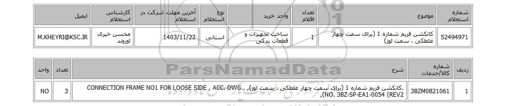 | 52494971 | کانکشن فریم شماره 1 (برای سمت چهار غلطکی ، سمت لوز) | 1 | ساخت تجهیزات و قطعات یدکی | استانی | 1403/11/22 | محسن خیری اوروند | M.KHEYRI@KSC.IR |