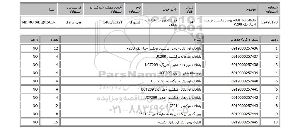 استعلام یاتاقان نوار نقاله پرس ماشین بریکت احیاء یک P208, استعلام یاتاقان نوار نقاله پرس ماشین بریکت احیاء یک P208