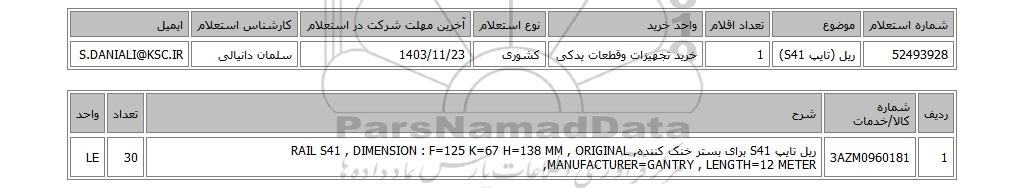 52493928ریل (تایپ S41)1خرید تجهیزات وقطعات یدکیکشوری1403/11/23سلمان دانیالیS.DANIALI@KSC.IR