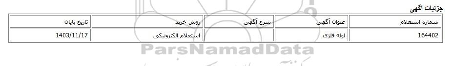 | 164402 | لوله فلزی | استعلام الکترونیکی | 1403/11/17 |