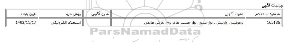 | 165136 | ترموفیت ، وارنیش ، نوار نسوز ،نوار چسب های برق ،فرش عایقی | استعلام الکترونیکی | 1403/11/17 |