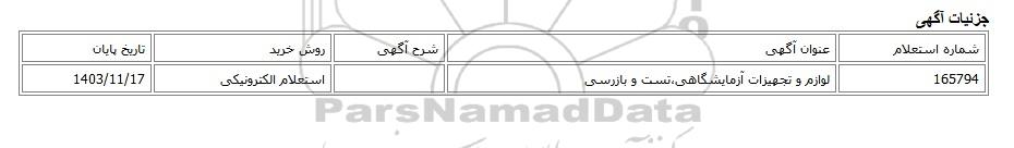 | 165794 | لوازم و تجهیزات آزمایشگاهی،تست و بازرسی | استعلام الکترونیکی | 1403/11/17 |