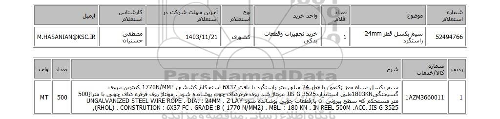 52494766سیم بکسل قطر 24mm راستگرد1خرید تجهیزات وقطعات یدکیکشوری1403/11/21مصطفی حسنیانM.HASANIAN@KSC.IR