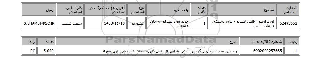 | 52493552 | لوازم ایمنی وآتش نشانی- لوازم پزشکی وبیمارستانی | 1 | خرید مواد مصرفی و اقلام عمومی | کشوری | 1403/11/18 | سعید شمس | S.SHAMS@KSC.IR |