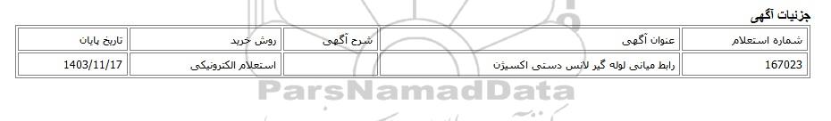 | 167023 | رابط میانی لوله گیر لانس دستی اکسیژن | استعلام الکترونیکی | 1403/11/17 |