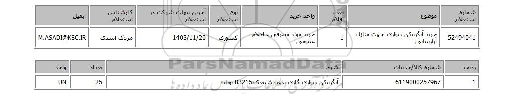 | 52494041 | خرید آبگرمکن دیواری جهت منازل آپارتمانی | 1 | خرید مواد مصرفی و اقلام عمومی | کشوری | 1403/11/20 | مزدک اسدی | M.ASADI@KSC.IR |