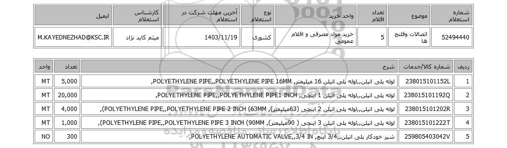 52494440اتصالات وفلنج ها5خرید مواد مصرفی و اقلام عمومیکشوری1403/11/19میثم کاید نژادM.KAYEDNEZHAD@KSC.IR