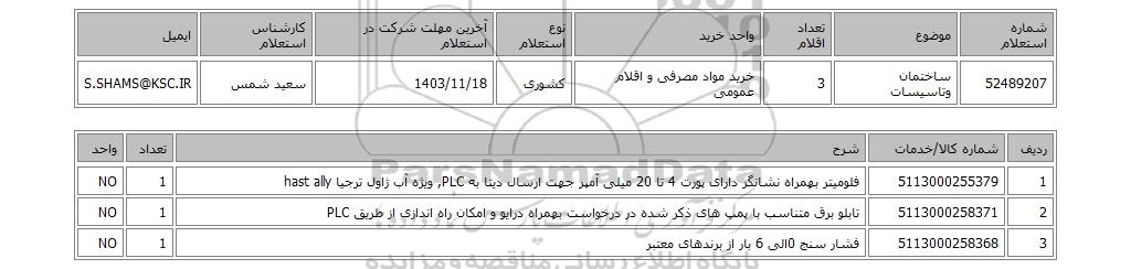 | 52489207 | ساختمان وتاسیسات | 3 | خرید مواد مصرفی و اقلام عمومی | کشوری | 1403/11/18 | سعید شمس | S.SHAMS@KSC.IR |