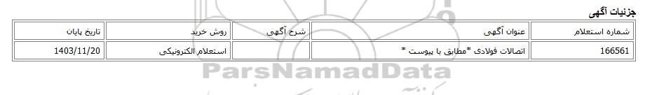 | 166561 | اتصالات فولادی *مطابق با پیوست * | استعلام الکترونیکی | 1403/11/20 |
