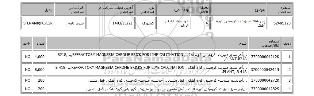 | 52495123 | آجر های منیزیت - کرومیتی کوره آهک | 4 | خریدمواد اولیه و انرژی | کشوری | 1403/11/21 | شیما نامی | SH.NAMI@KSC.IR |