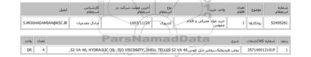 | 52495261 | روانکارها | 1 | خرید مواد مصرفی و اقلام عمومی | کشوری | 1403/11/20 | صادق مقدمیان | S.MOGHADAMIAN@KSC.IR |