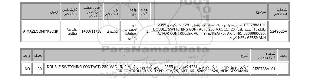 | 52495254 | 3JZE788A101 میکروسوئیچ جوی استیک جرثقیل 4281 کانوکرن و 2355 دانیلی (آرشیو دارد) &DOUBLE SWITCHING CONTACT, 250 VAC 15, 2 A, FOR CONTROLLER V6, TYPE: KEA/75, ART. NR: 5209900626, MFR: GESSMANN کوتاه | 1 | خرید تجهیزات وقطعات یدکی | کشوری | 1403/11/18 | علیرضا مظلوم | A.MAZLOOM@KSC.IR |