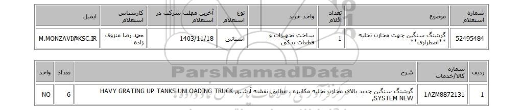 52495484گریتینگ سنگین جهت مخازن تخلیه **اضطراری**1ساخت تجهیزات و قطعات یدکیاستانی1403/11/18محمد رضا منزوی زادهM.MONZAVI@KSC.IR