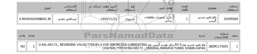 52495569والو تغییر مسیر گریس1خرید تجهیزات وقطعات یدکیکشوری1403/11/21عبدالامیر مقدمA.MOGHADAM@KSC.IR