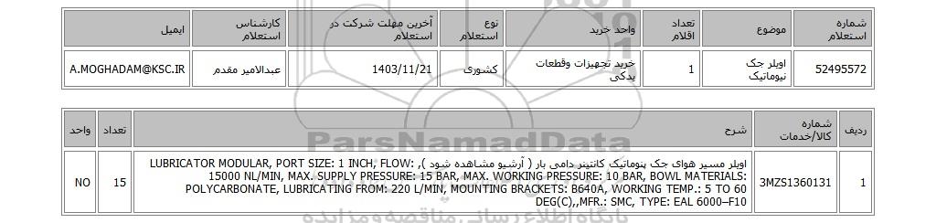 | 52495572 | اویلر جک نیوماتیک | 1 | خرید تجهیزات وقطعات یدکی | کشوری | 1403/11/21 | عبدالامیر مقدم | A.MOGHADAM@KSC.IR |