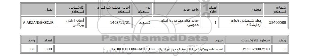 52495588مواد شیمیایی ولوازم آزمایشگاه1خرید مواد مصرفی و اقلام عمومیکشوری1403/11/21آرمان ارزانی بیرگانیA.ARZANI@KSC.IR