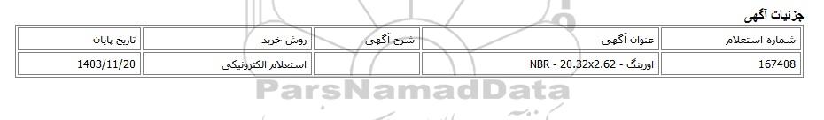 | 167408 | اورینگ - NBR - 20.32x2.62 | استعلام الکترونیکی | 1403/11/20 |