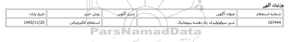 | 167444 | شیر سولونوئیدی راه دهنده پنیوماتیک | استعلام الکترونیکی | 1403/11/20 |