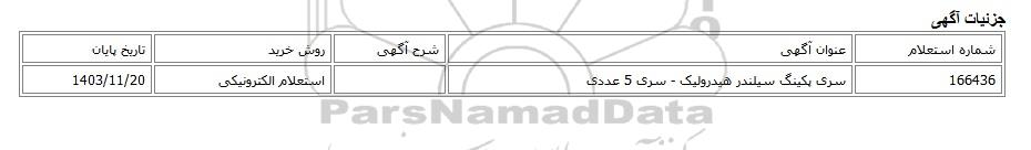 | 166436 | سری پکینگ سیلندر هیدرولیک - سری 5 عددی | استعلام الکترونیکی | 1403/11/20 |